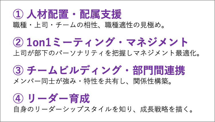 PPES様の事例から、Facet5が多様なチームにおける相互理解を深め、コミュニケーションを活性化させる強力なツールであることが明らかになりました。特に、新しいチームの立ち上げやプロジェクト型組織において、メンバーの「取扱説明書」として活用することで、スムーズな連携とチーム力の向上に貢献します。チームビルディングに限らず、例えば以下ようなあらゆるシーンでFacet5の診断結果をご活用いただけます。