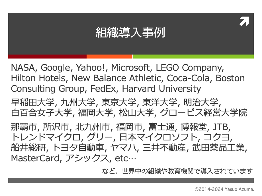 国内では、大手飲食チェーン、製菓メーカー、電力会社、ハウス系メーカー、テレビ局、運輸系企業、ゲームメーカー、生命保険会社、行政機関、教育機関など、多岐にわたる業界でレゴ®シリアスプレイ®が導入されています。職種も営業、研究開発、事務、経営層など問いません。